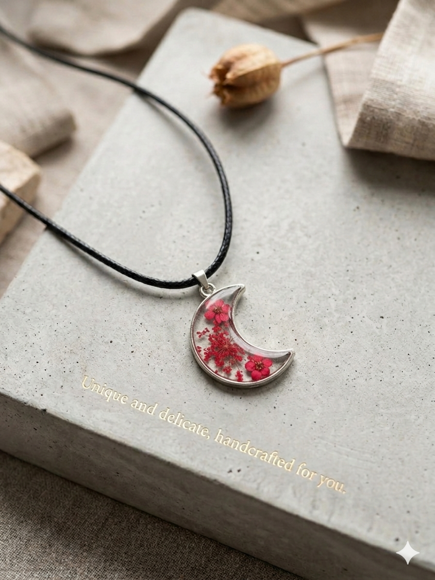 Portez un brin de poésie avec ce collier unique. Ces véritables fleurs minutieusement séchées et figées dans la résine, semblent capturer un instant de pur bonheur. Entouré d'un délicat cadre argenté, ce pendentif en forme de lune est une ode à la beauté de la nature. Il est le cadeau idéal pour celles qui aiment la discrétion et l'originalité. Un bijou qui raconte une histoire.